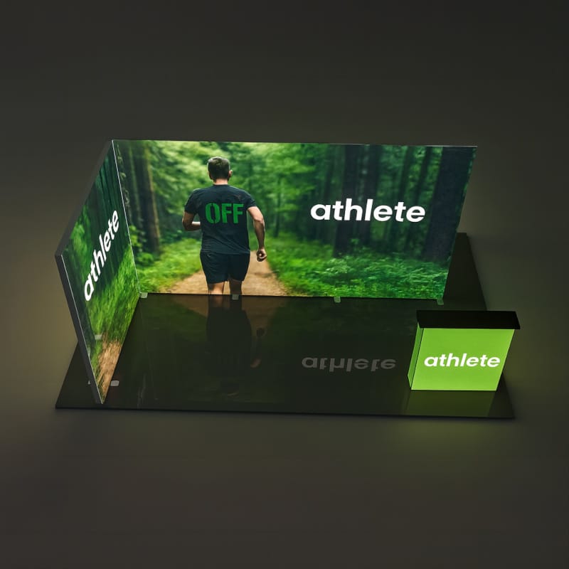 BOX-STUDIO SEVEN bietet dir ein kraftvolles Komplettset für mittlere bis große LED Messestände – ideal für Markenauftritte, die auffallen sollen. Die Kombination aus einer 585 × 250 cm großen LED-Messewand, einer zusätzlichen 285 × 250 cm Wand und einem beleuchteten Counter (100 × 100 cm) sorgt für ein beeindruckendes Gesamtbild mit enormer Fernwirkung – sowohl auf Messen als auch bei Events oder Roadshows.